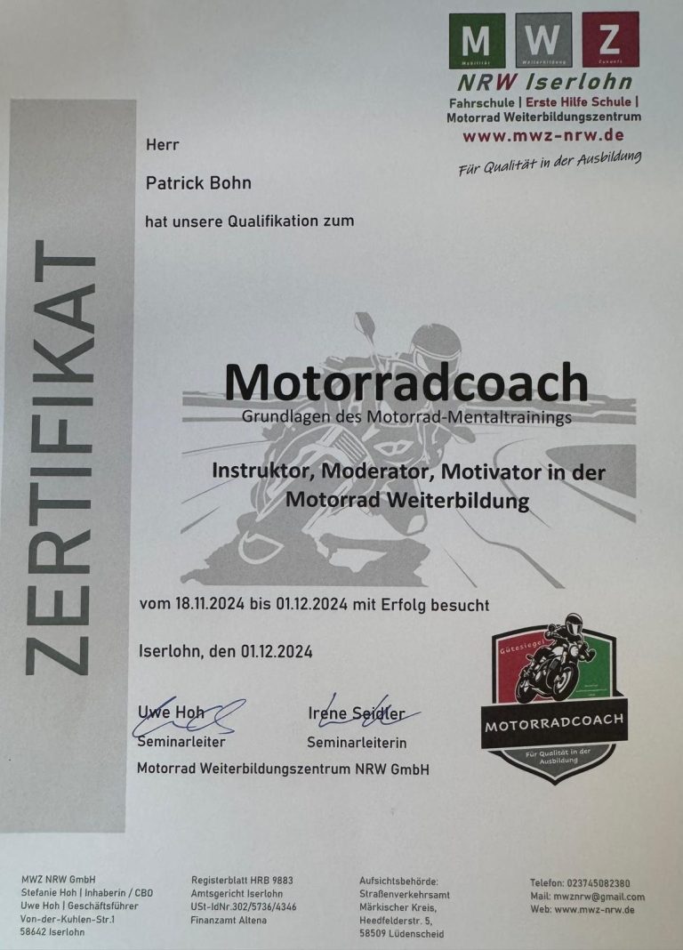 Motorradfahren ist mehr als nur Technik – es erfordert auch eine starke mentale Haltung. In meinen Coachings kombiniere ich technische Übungen mit mentalem Training, um dir zu helfen, Ängste abzubauen und deine Konzentration zu steigern. So kannst du nicht nur deine Fahrtechnik verbessern, sondern auch mit mehr Selbstvertrauen und Ruhe auf der Straße unterwegs sein.